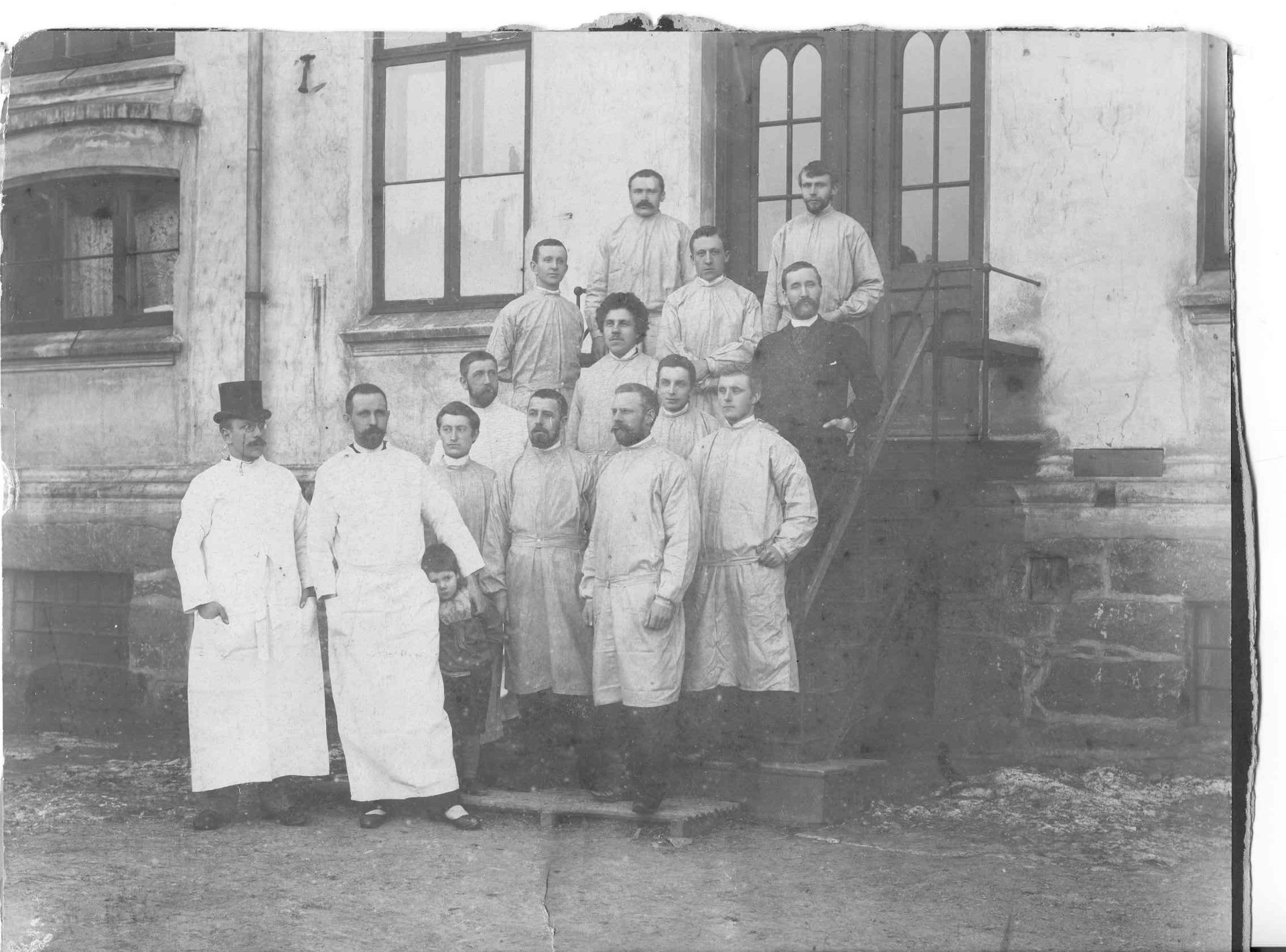 Staben ved Diakonhjemmets sykehus på trappen til Magdalenahjemmet i 1895. Mennene i lange frakker er reservelege Anton Smith (lengst til venstre, i flosshatt) og overdiakon Ole Bornemann Bull. Diakonelevene i noe kortere arbeidsantrekk og økonomi- og driftsansvarlige Herbrand Golsen Flaata i mørk dress. (Foto: Misjons- og diakoniarkivet, VID vitenskapelige høgskole)